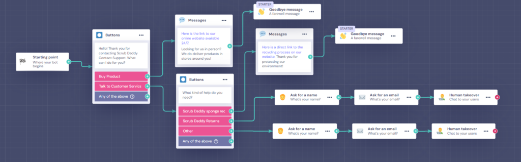 Overall, the process was very easy and simple to do. It took us about 10 minutes to do the one we made. Every step was walked through by the website and changing anything was also easy. It works like a flow chart, making it very easy to understand. Since it is so easy, it may be an easier process than adding specific web pages on the website since the chatbot can be a catch-all, contacting human support if the question still needs to be answered. Suppose there is one place to answer any question and find any contact information. In that case, customers will be happier to use the one chatbot since they won’t have to search around for any sort of contact information like they currently do on the website.